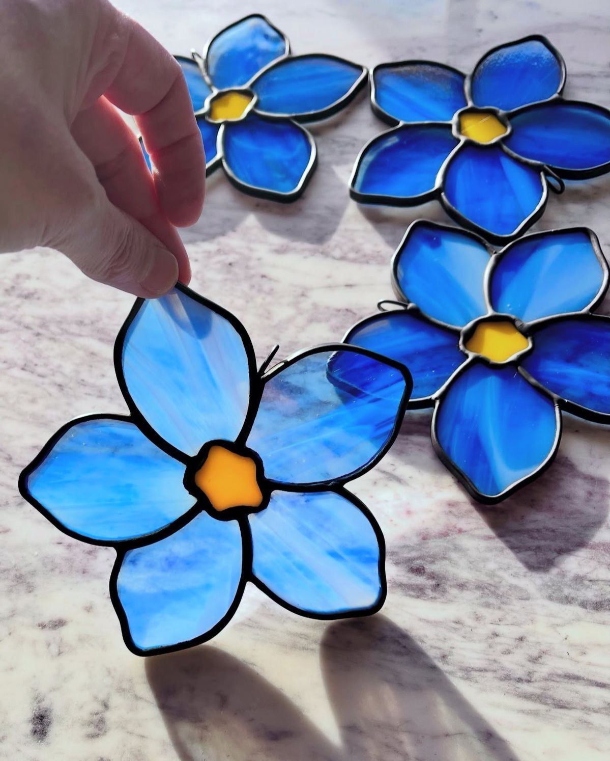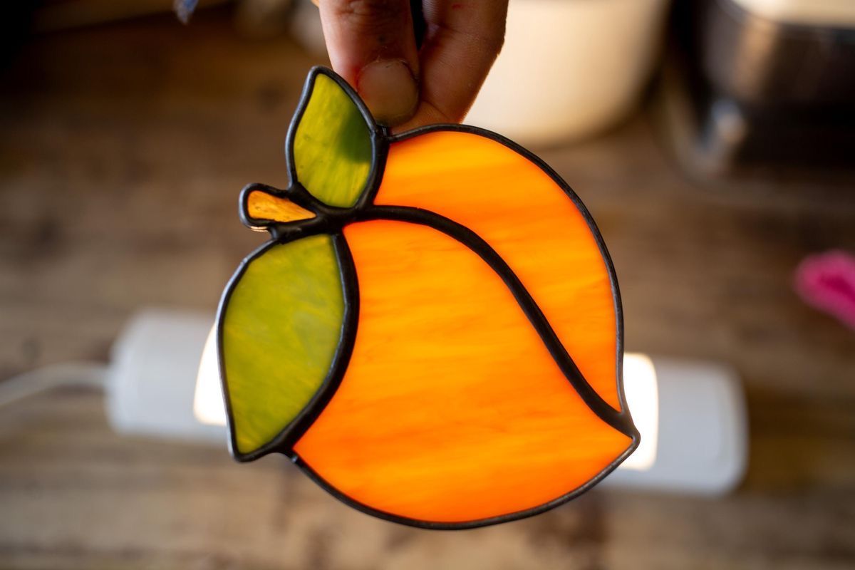 Numbering, marking the glass, cutting and polishing. Wrapping all the glass pieces in copper tape, soldering them together with tin using the Tiffany technique.