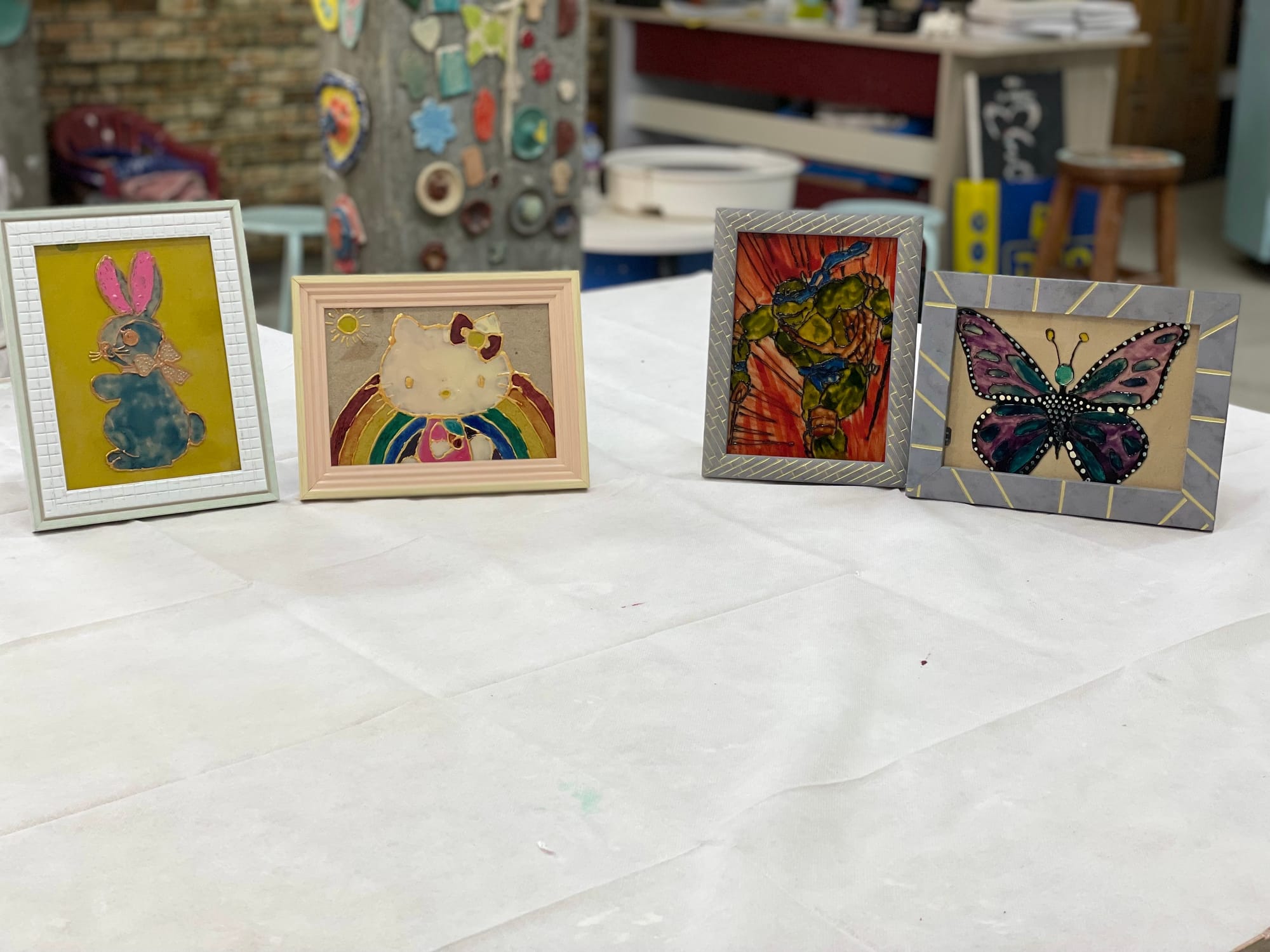 Decoration, design and painting on glass frames/glass dishes. Fired in the kiln at the temperature of 550 degrees for 24 hours until it cools down.